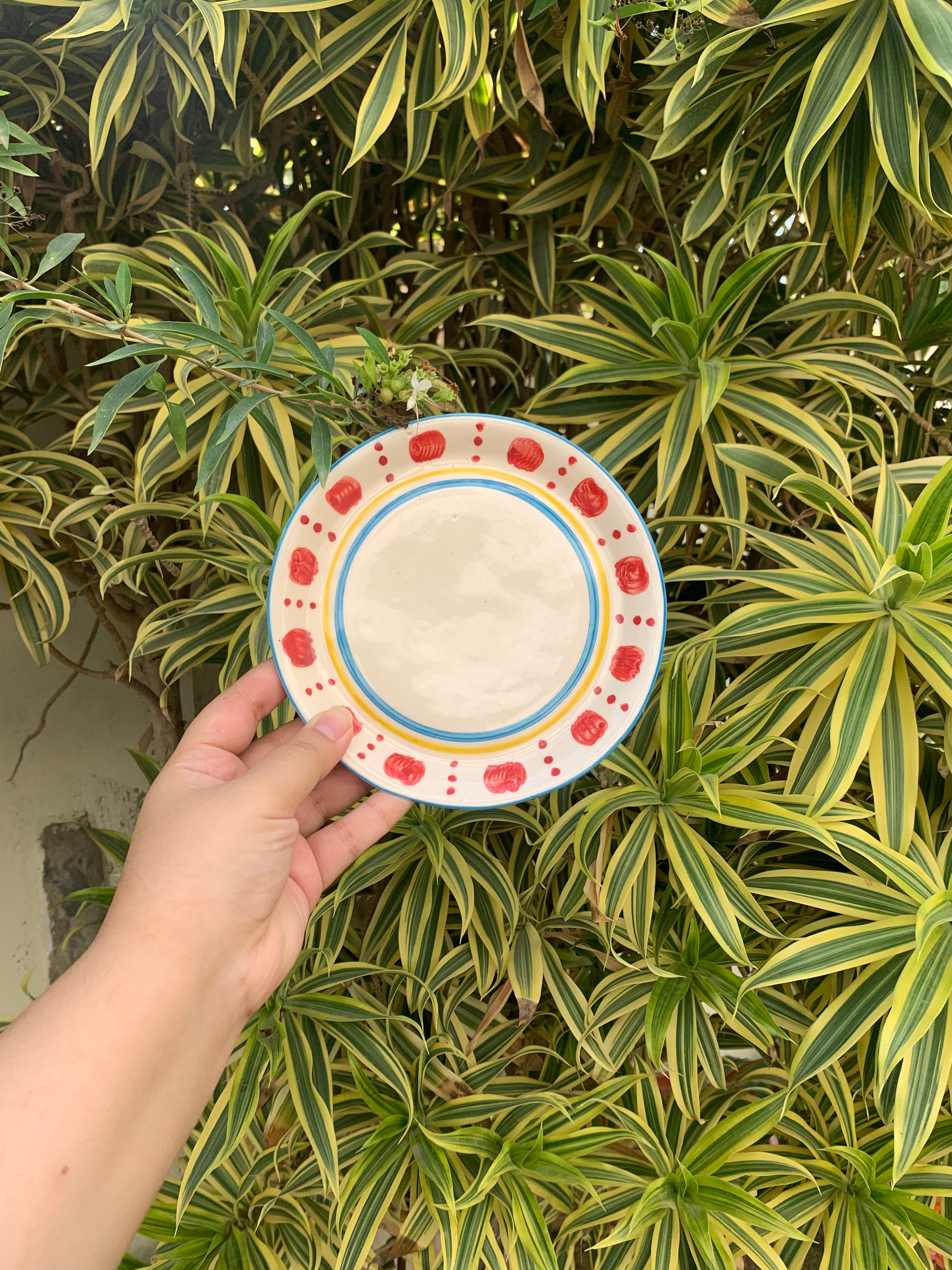 Intricately crafted handmade 6-inch plate with a hand painted Red dots border design with a sleek blue circle along the inside border.