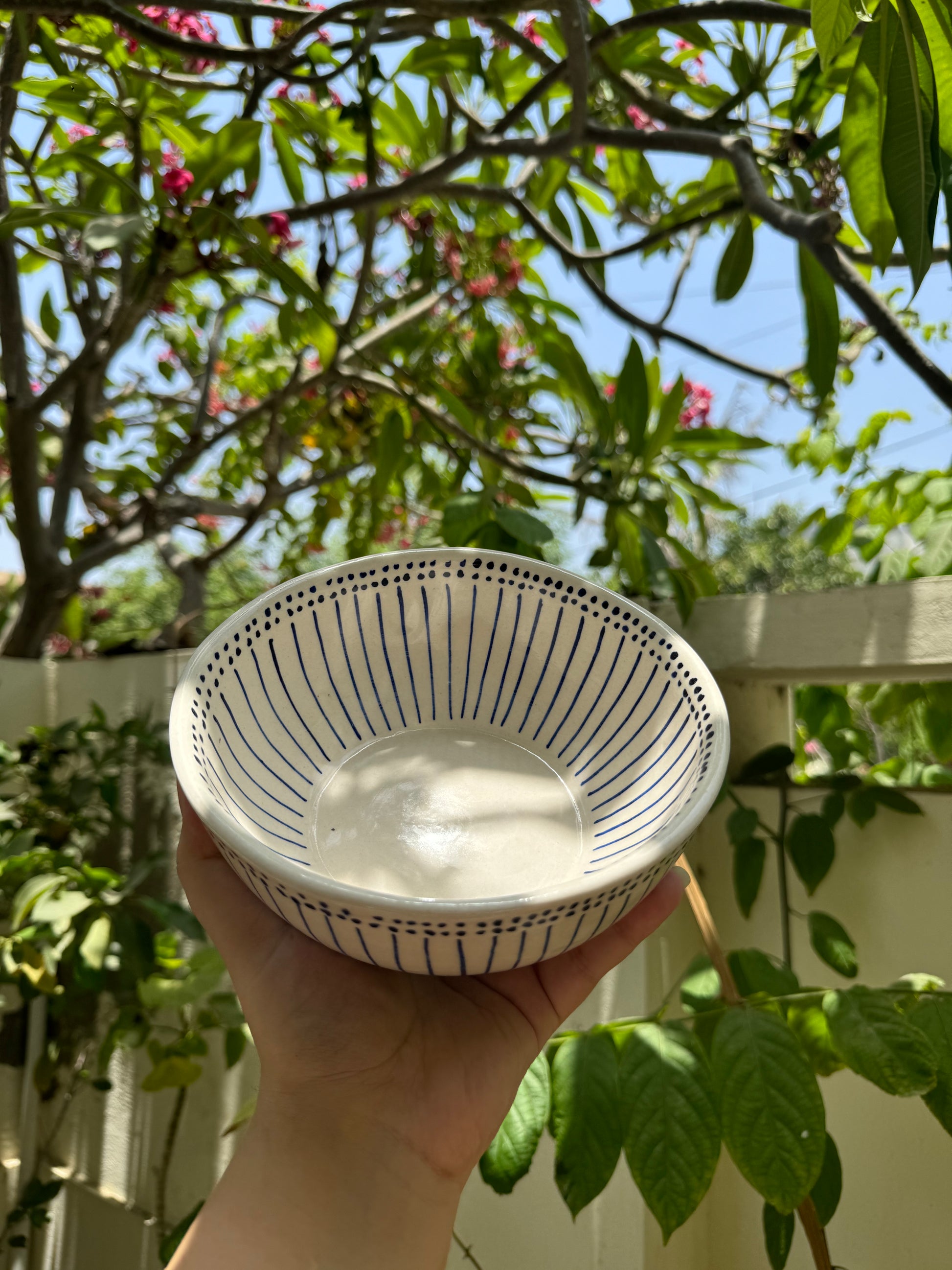 Our handmade ceramic bowls are works of art by Pakistan's talented artisans. Microwave and dishwasher safe, the Sleek Blue Lines Bowl is the perfect addition to your ceramic tableware collection, adding a touch of elegance to every meal.