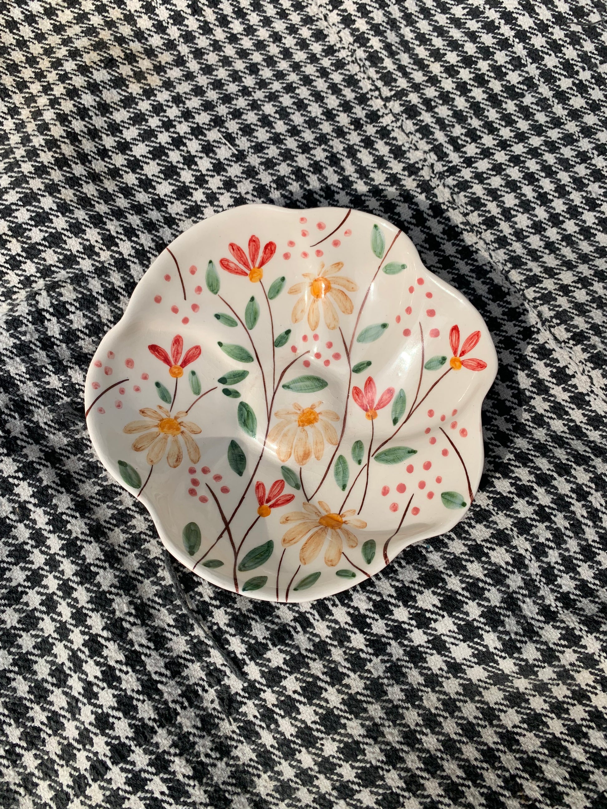 Add a touch of joy to your everyday table with our Wildflower Bloom Bowl (8 inches). Handcrafted with care and painted in a cheerful mix of daisies and tiny floral sprigs, this piece captures the freshness of a spring meadow. Its scalloped edges give it a delicate, elegant shape, making it perfect for serving salads, pastas, snacks, or even as a centerpiece.